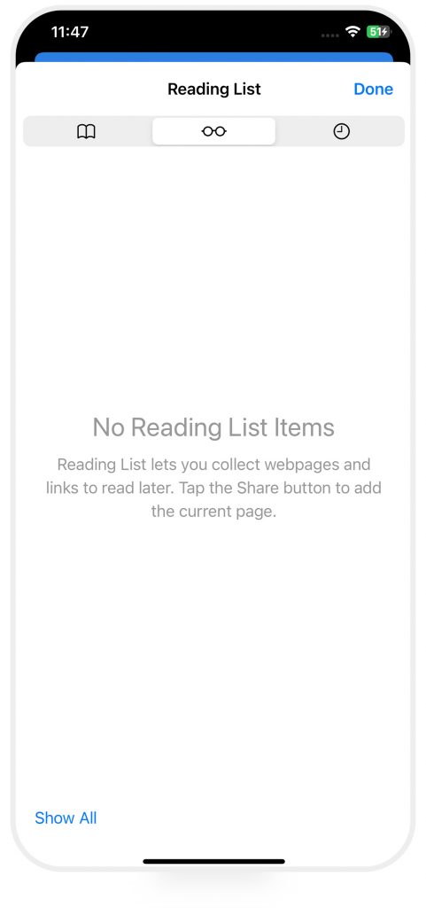 مرورگر سافاری را باز کنید و قسمت Reading List را انتخاب کنید.